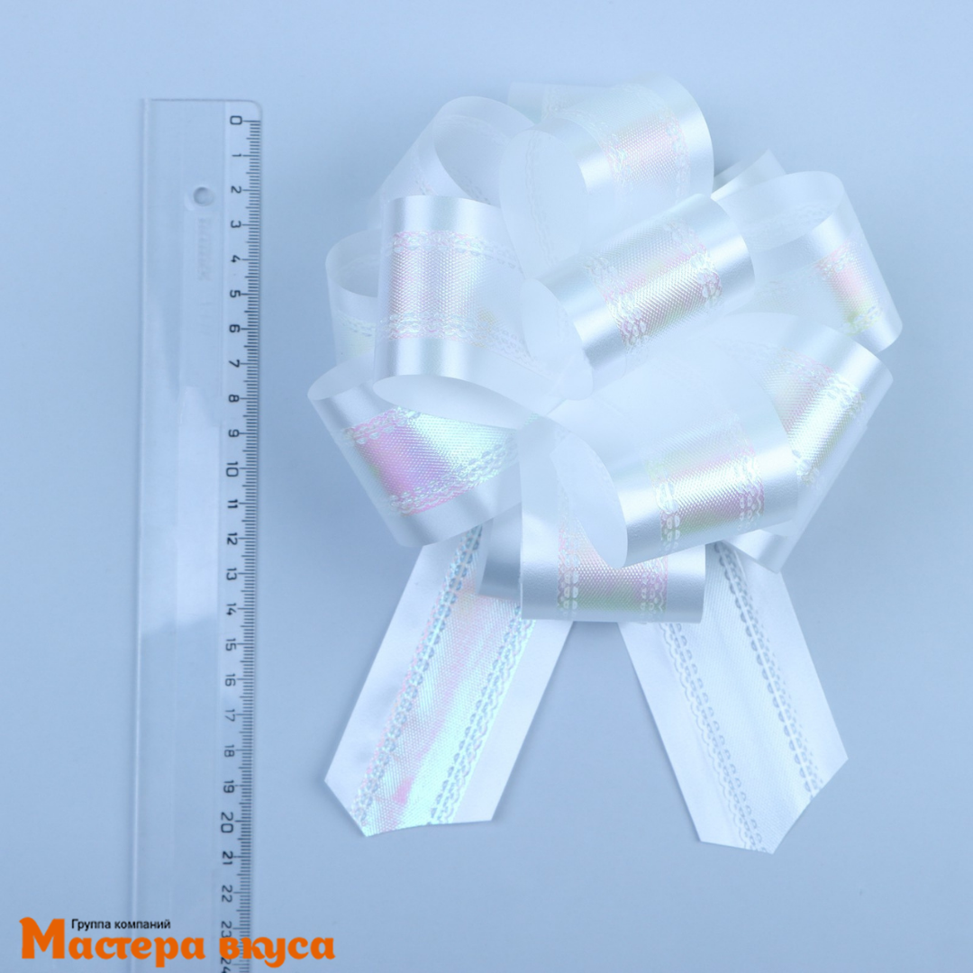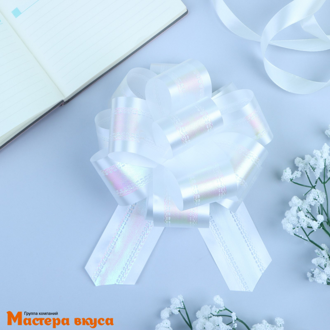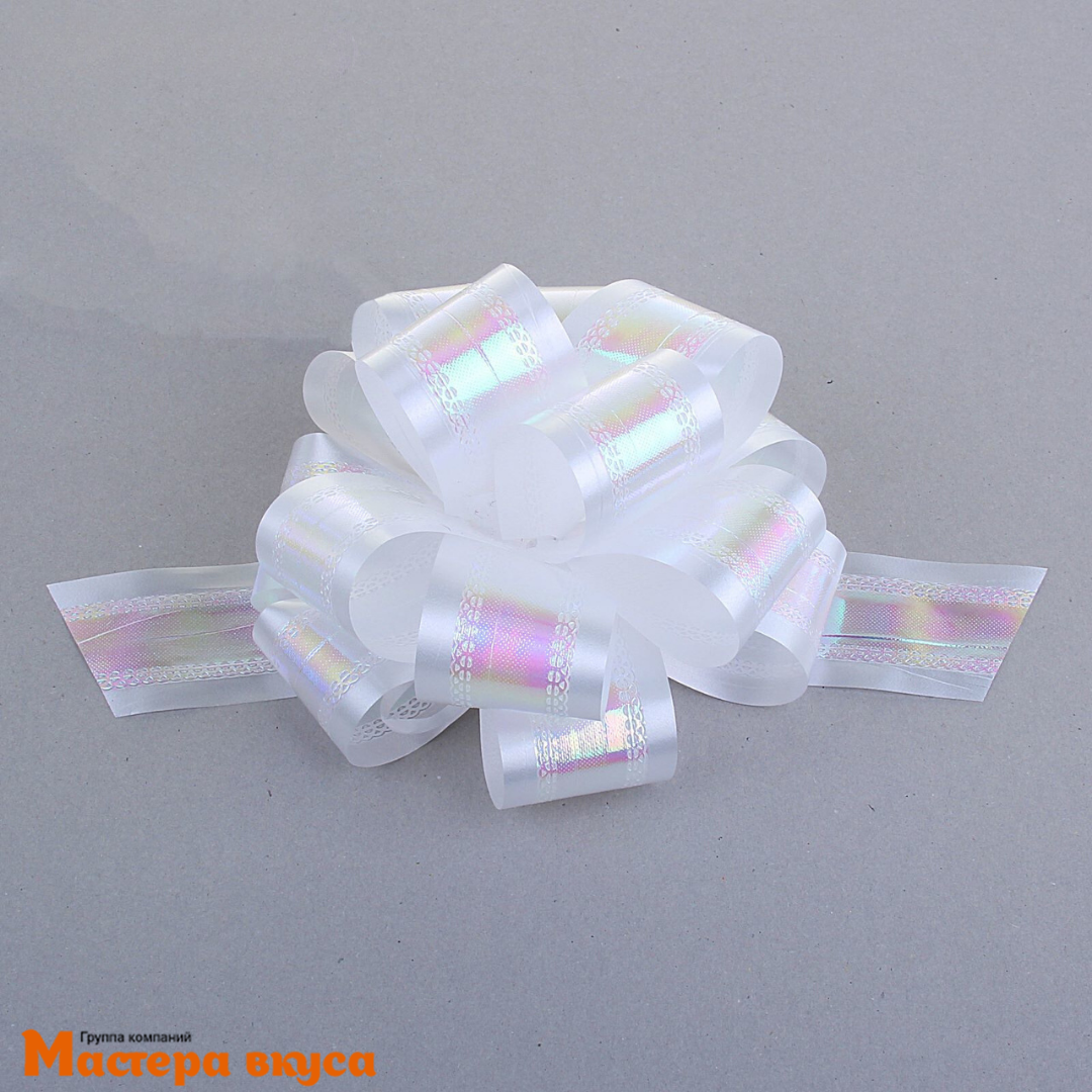 Для того чтобы собрать бант, надо потянуть за две ленточки, находящиеся между широкими лентами, удерживая широкие ленты в месте спайки. Бант собирается за несколько секунд.